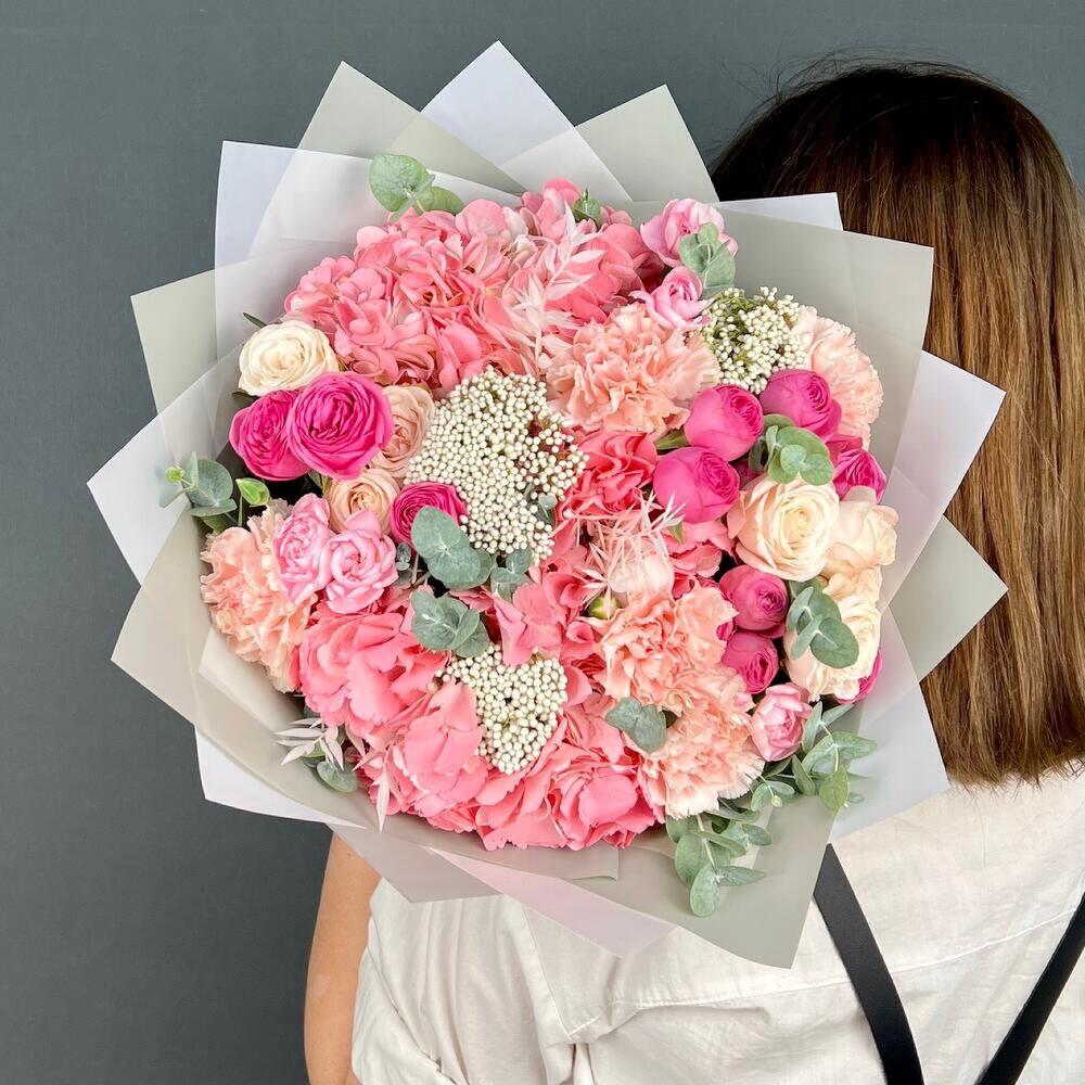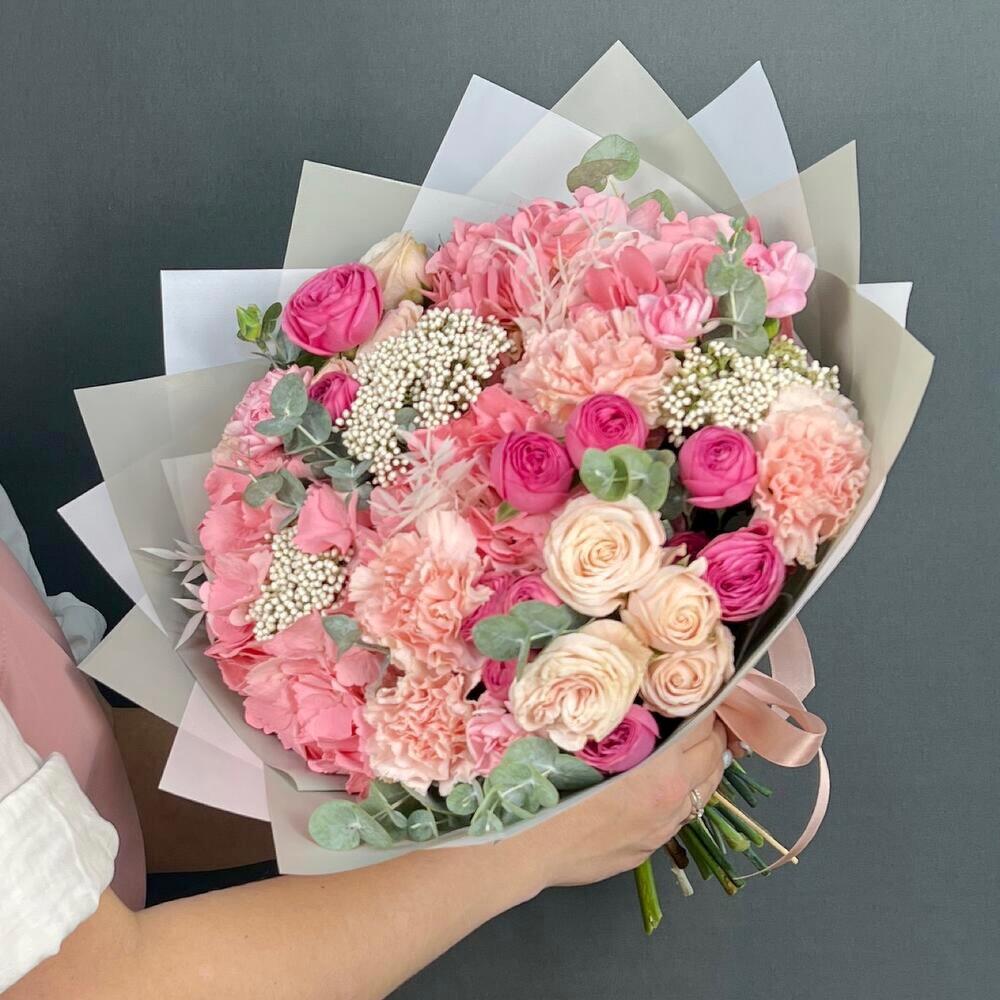 Авторский букет из розовых Гортензий и кустовых пионовидны Роз