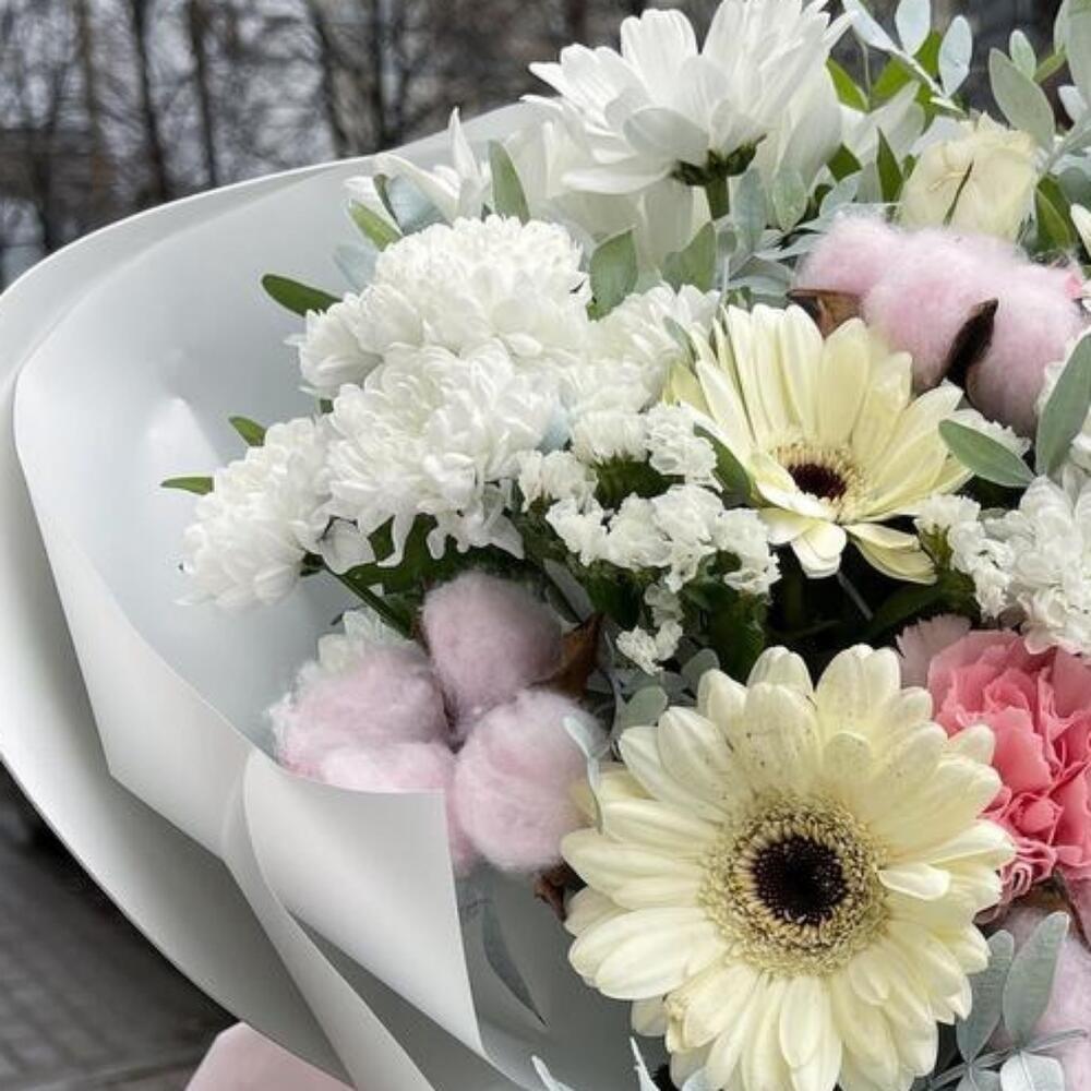 Гербера мини – 5 шт.Гвоздика – 3 шт.Хризантема кустовая – 1 шт.сантинии белые – 2 шт.Роза – 2 шт.Хлопок натуральный – 3 шт.Фисташка пучок – 1 шт.Пленка матовая – 4 шт.Лента атласная – 2 шт.фаомиран – 1 шт.