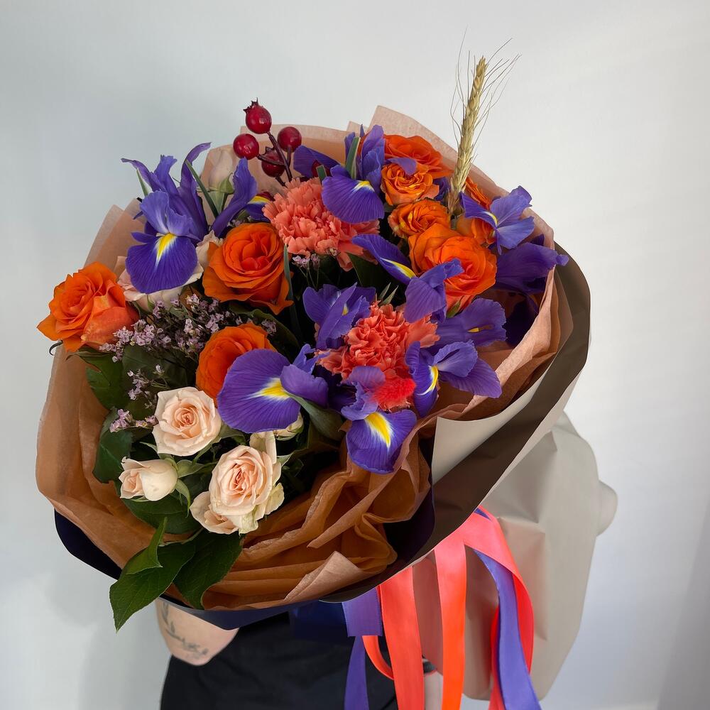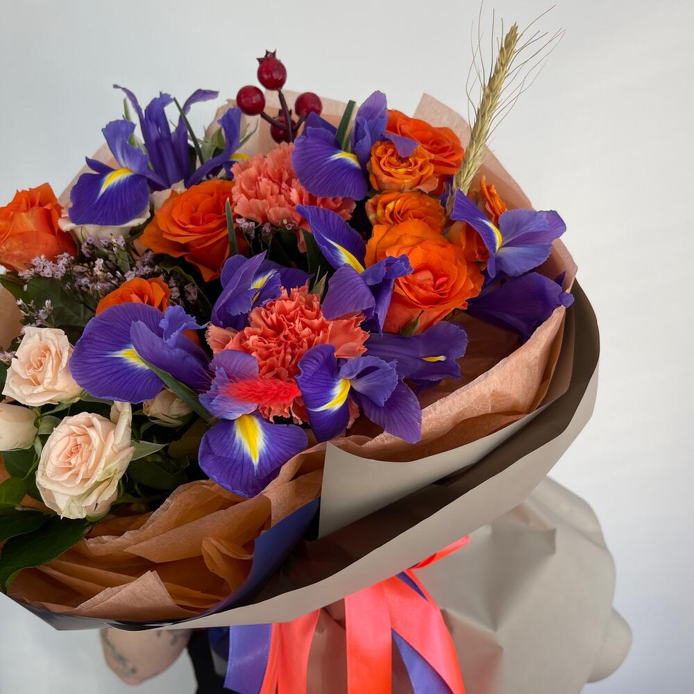 Ирис – 5 шт.Диантус – 2 шт.Кустовая роза – 3 шт.Роза – 5 шт.Ягоды декоративные – 1 шт.Пшеница (сухоцвет) – 1 шт.Лимониум – 1 шт.Салал пучок – 1 шт.Тишью – 2 шт.Пленка матовая – 2 шт.Лента атласная – 2 шт.