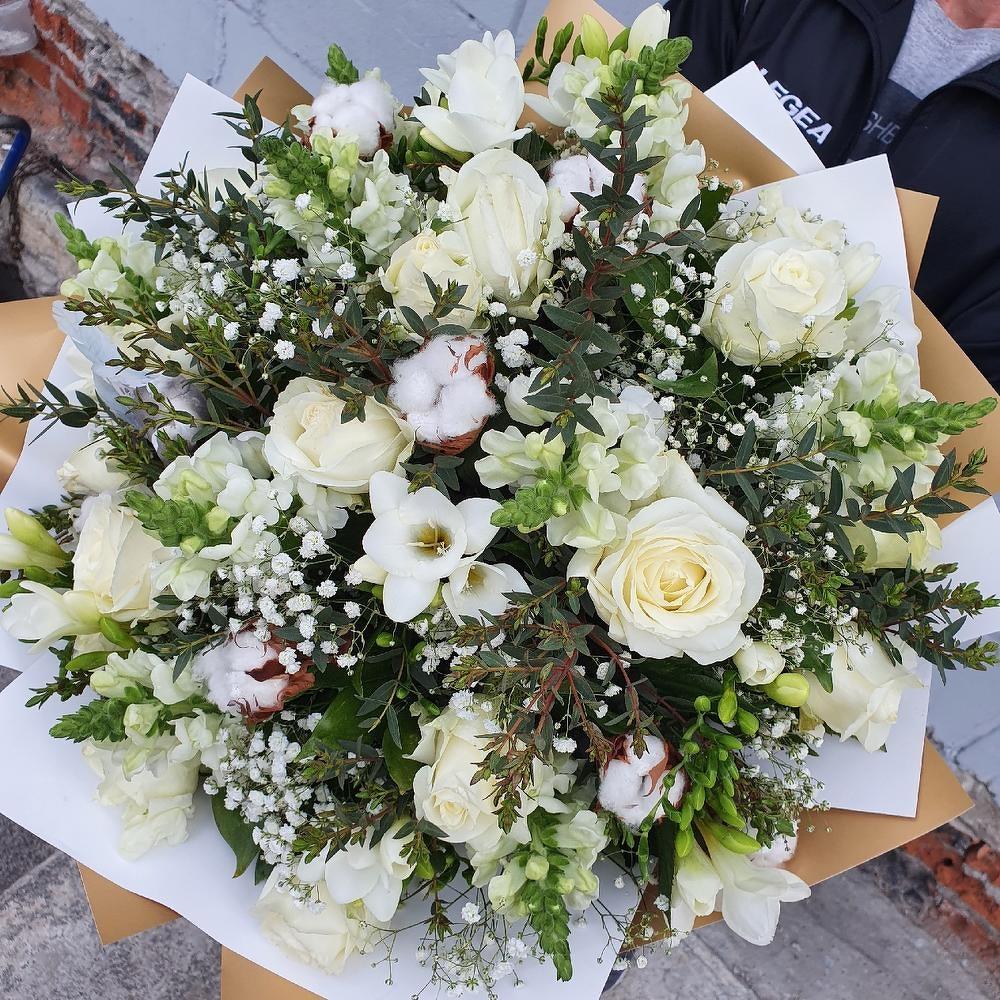 Гипсофила – 4 шт.Эвкалипт – 5 шт.Зелень – 25 шт.Роза белая – 19 шт.Фрезия белая – 10 шт.Упаковка дизайнерская – 5 шт.Львиный зев – 10 шт.Птичка декоративная – 1 шт.Хлопок натуральный – 5 шт.