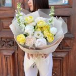 Маттиола – 3 шт.Лента атласная – 2 шт.Диантус – 3 шт.Пион белый – 3 шт.Пленка матовая – 7 шт.эустома махровая белая – 1 шт.роза кустовая пионовидная желтая – 2 шт.