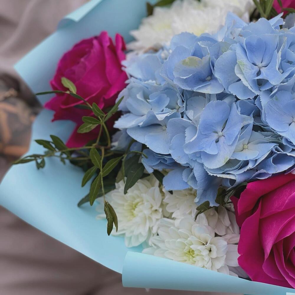 Гортензия – 1 шт.Роза – 3 шт.Хризантема кустовая – 3 шт.Фисташка пучок – 1 шт.бумага дизайнерская – 1 шт.Лента – 1 шт.