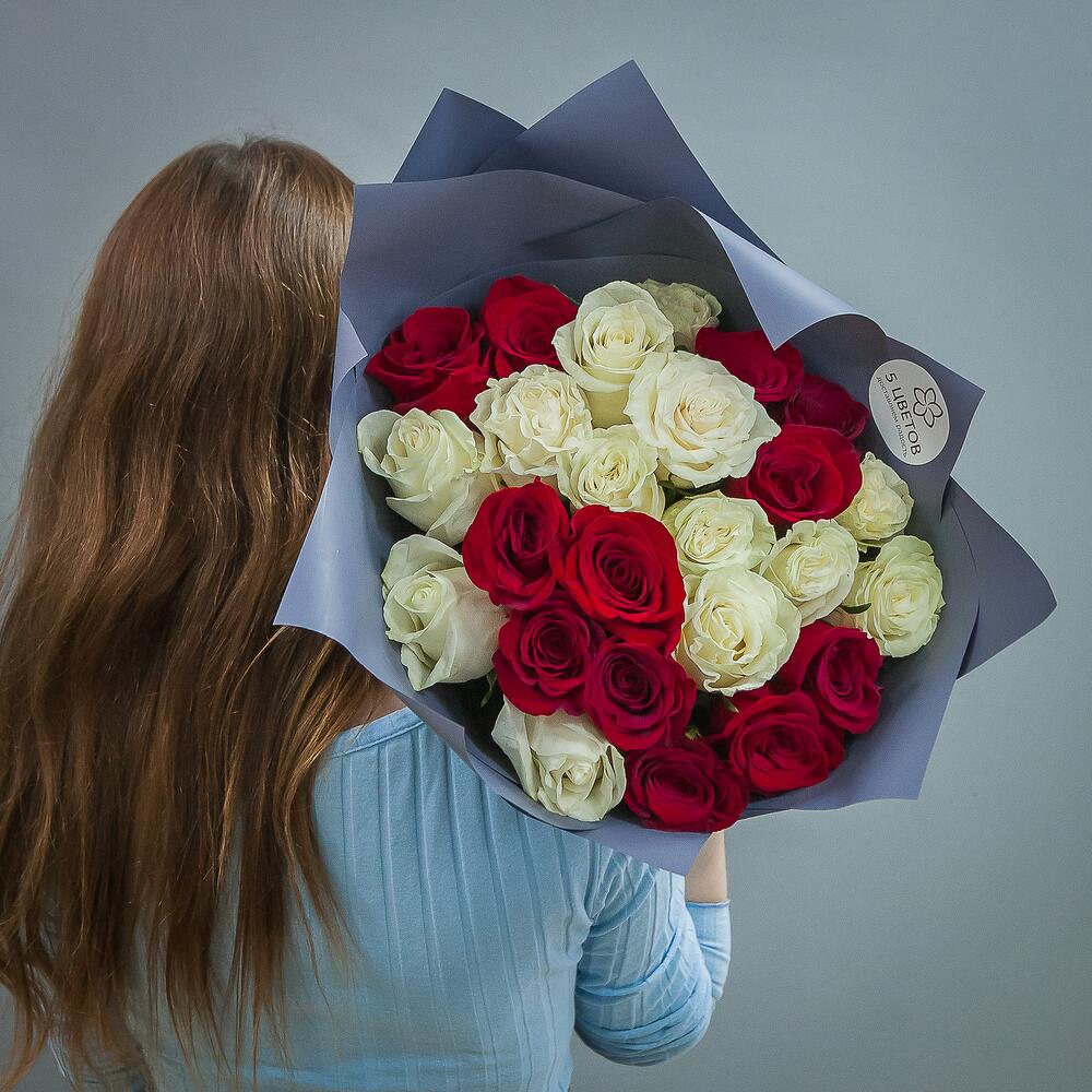 розы – 25 шт.Атласная лента – 1 шт.Матовая пленка – 1 шт.