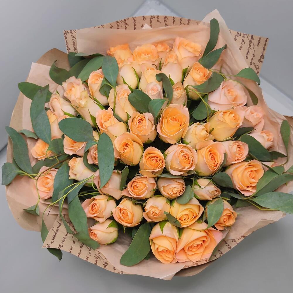 Букет из 51 розы персиковой с эвкалиптом