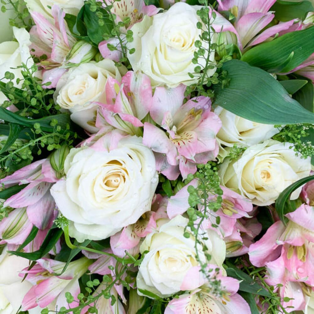 Упаковка – 1 шт.состав – белая роза 15 шт – 1 шт.альстромерия розовая – 7 шт + зелень – 1 шт.