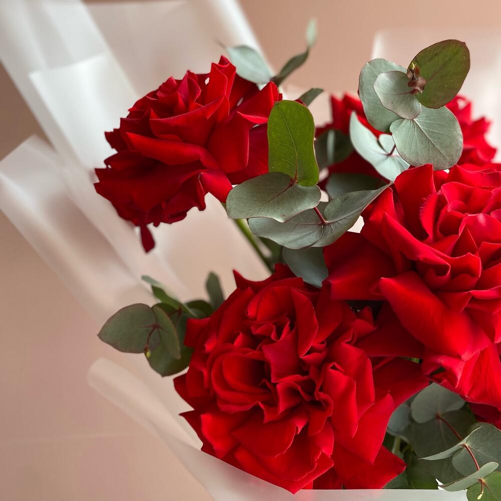 Букет из красных роз«Алый закат» (розы красные французские, эвкалипт)