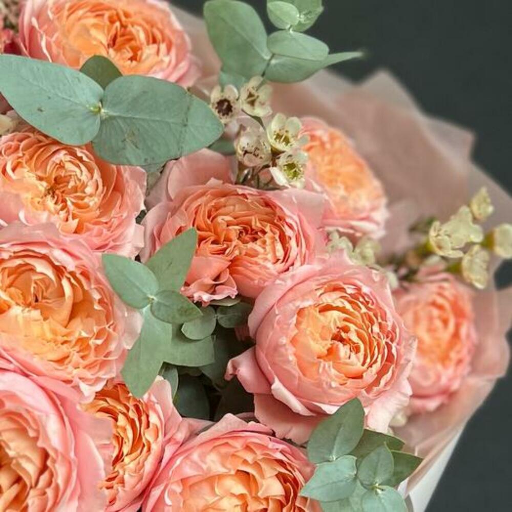 Букет из кустовой пионовидной розы, хамелациум и эвкалипт