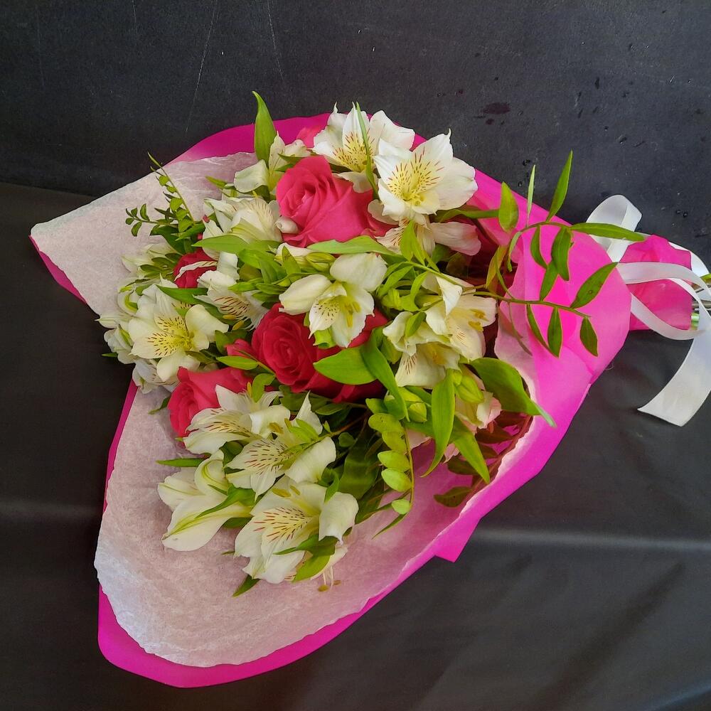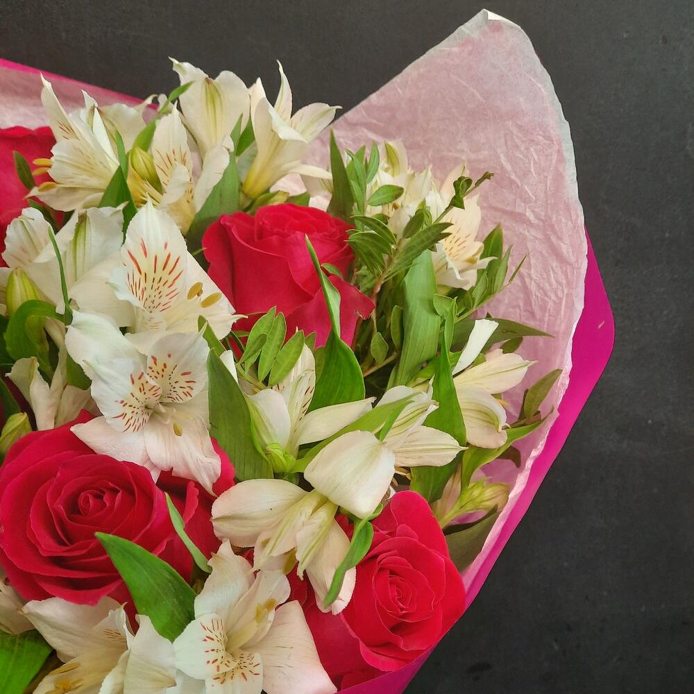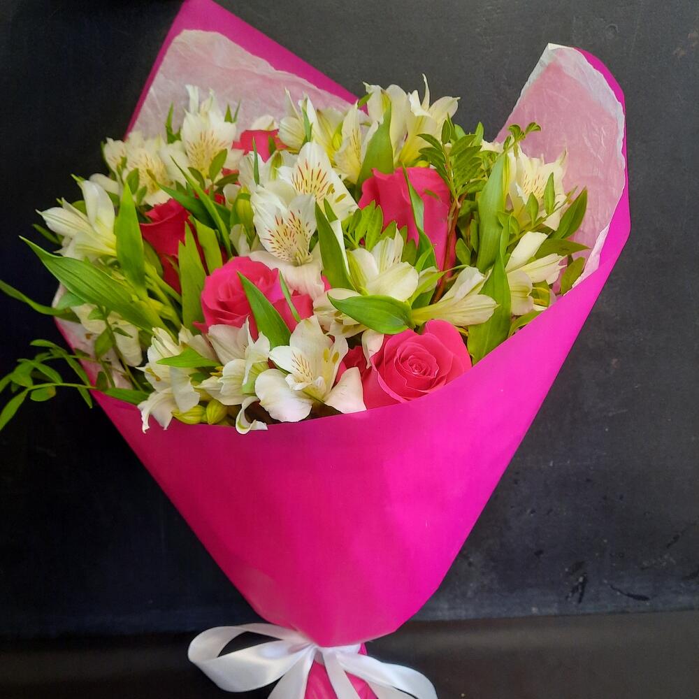 Букет из малиновых роз и белой альстромерии