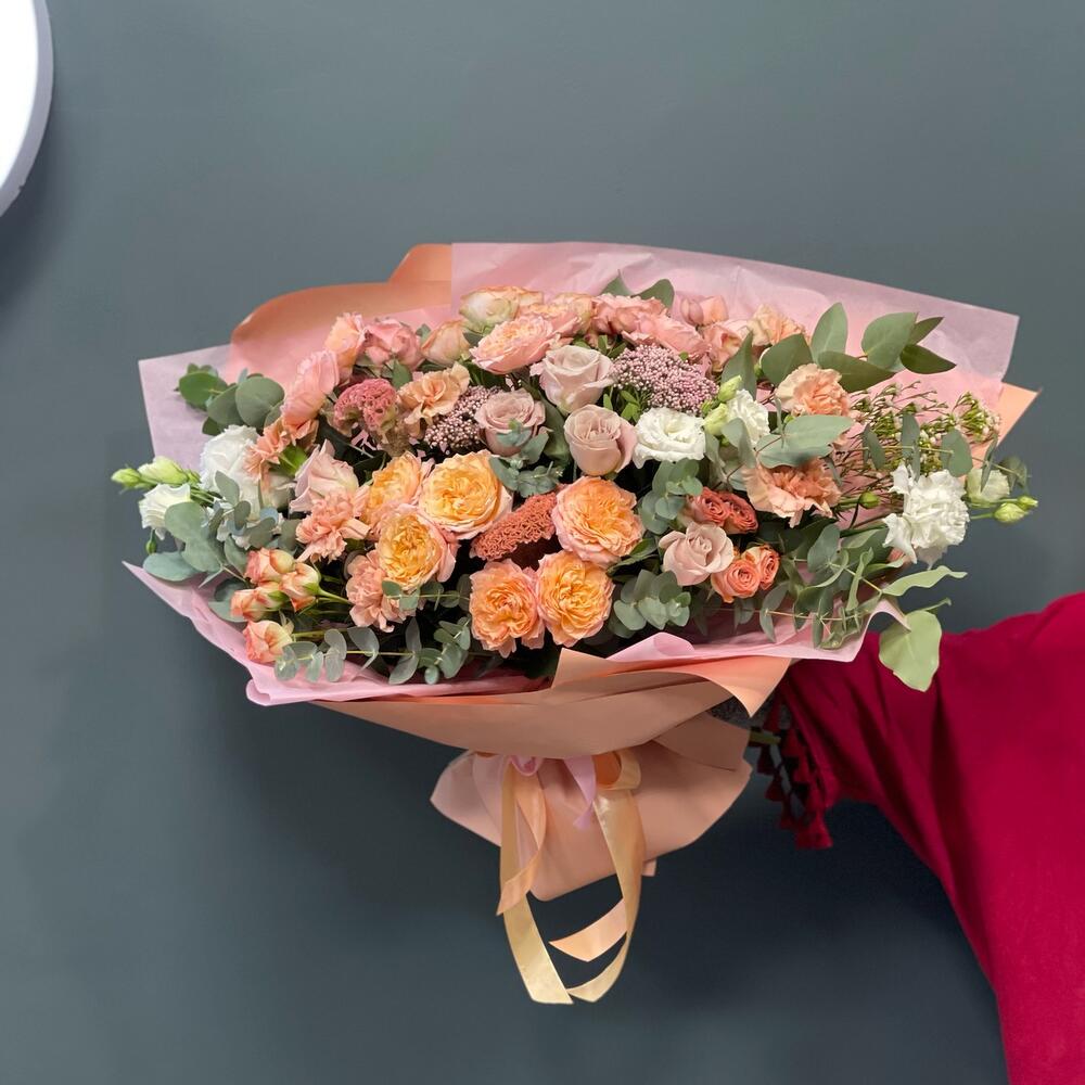 Роза пионовидная кустовая – 4 шт.Роза одноголовая – 5 шт.Гвоздика сортовая – 7 шт.Лизиантус – 3 шт.Ваксфлауэр – 1 шт.Роза кустовая – 2 шт.Озотамнус – 2 шт.Эвкалипт – 3 шт.Фисташка – 5 шт.Упаковка – 3 шт.Лента атласная – 2 шт.