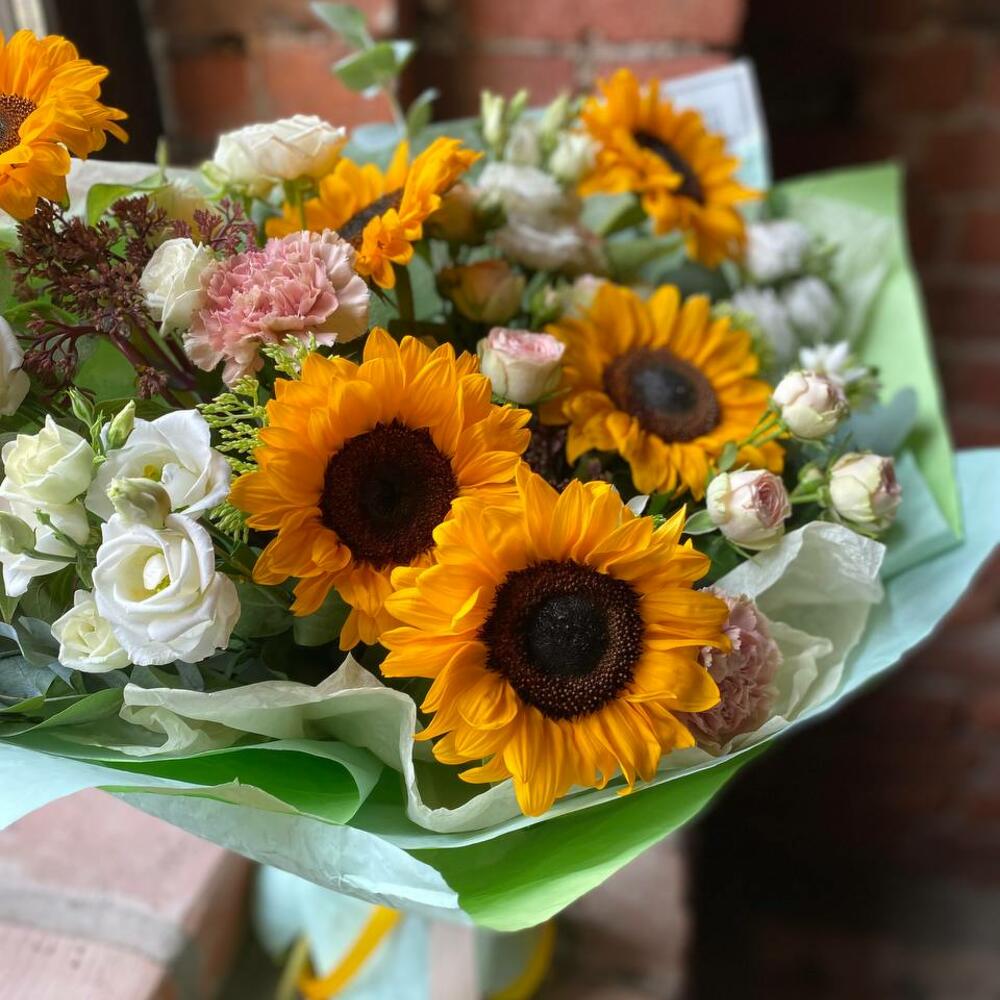 Эвкалипт – 3 шт.Упаковка – 2 шт.Эустома – 5 шт.Диантус – 2 шт.Орнитогалум – 2 шт.Подсолнух – 7 шт.Роза кустовая пионовидная – 4 шт.Седум – 4 шт.