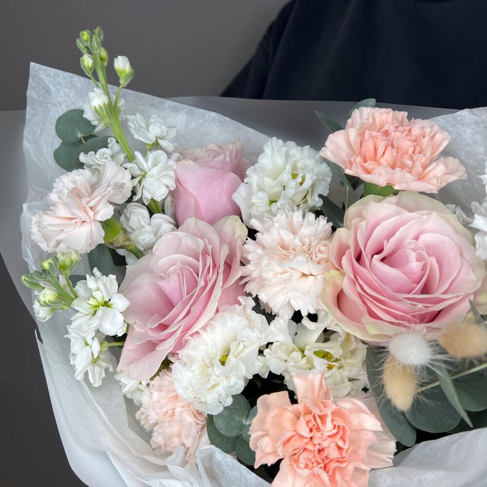 Лизиантус – 1 шт.Маттиола – 3 шт.Роза – 3 шт.Диантус – 5 шт.Упаковка дизайнерская – 1 шт.комплимент от polyanka – 1 шт.