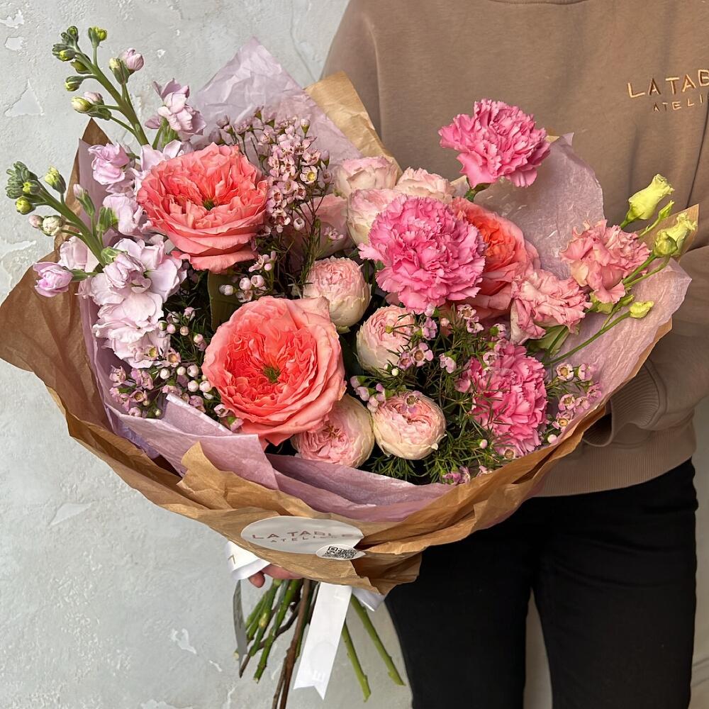 Роза пионовидная – 3 шт.Роза пионовидная кустовая – 2 шт.Гвоздика – 3 шт.Маттиола – 2 шт.Ваксфлауэр – 3 шт.Лизиантус – 1 шт.Упаковка дизайнерская – 1 шт.