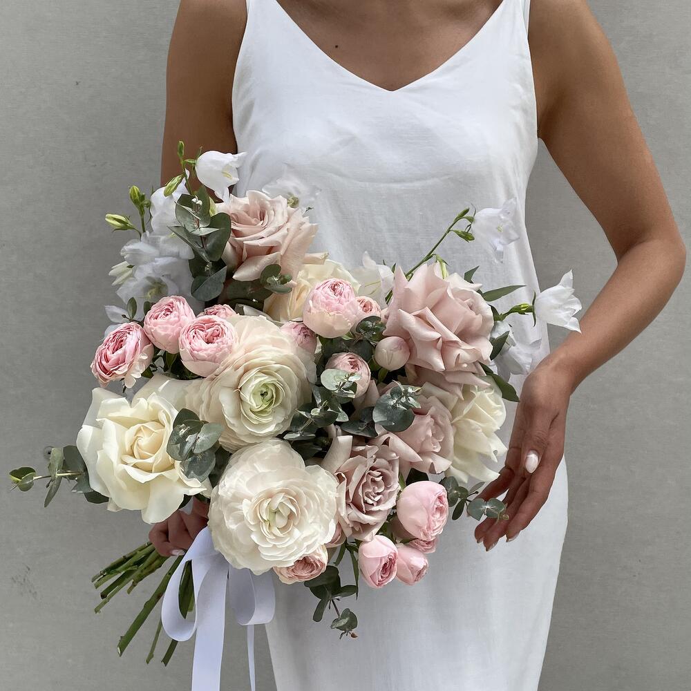 сортовые розы – 9 шт. ранункулусы – 2 шт. пионовидные спрей роза – 5 шт. колольчик – 5 шт. Эвкалипт – 3 шт.