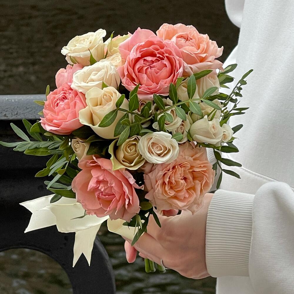 Роза кустовая – 3 шт.Роза одноголовая – 7 шт.Лента атласная – 3 шт.Фисташка – 2 шт.Роза Джульетта – 2 шт.