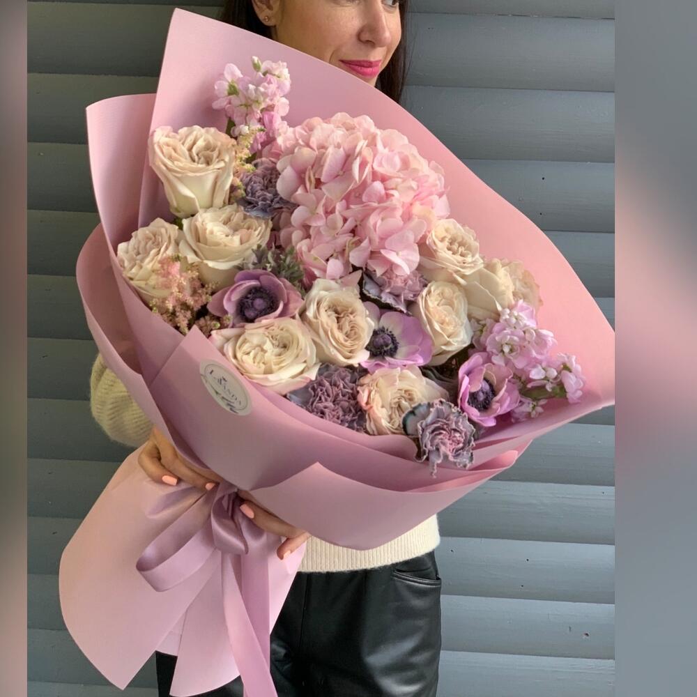 Альстромерии, Гортензии, Кустовые розы, Лизиантусы, Розы, Хризантемы