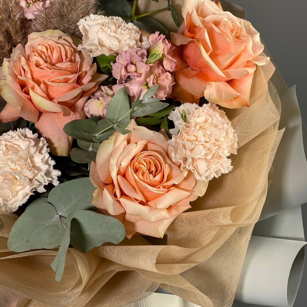 Лента – 2 шт.Маттиола – 3 шт.Эвкалипт – 2 шт.Роза одноголовая – 3 шт.Фисташка – 3 шт.Упаковка дизайнерская – 1 шт.Гвоздика одноголовая – 5 шт.камыш сухоцвет – 2 шт.