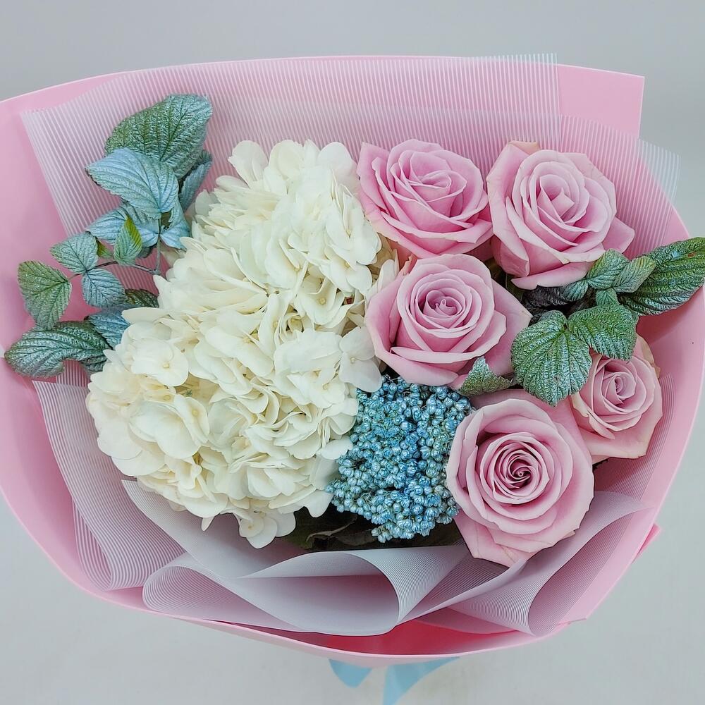 Гортензия – 1 шт.Озотамнус – 1 шт.Роза Эквадор – 5 шт.Упаковка дизайнерская – 1 шт.рубус зелень – 5 шт.