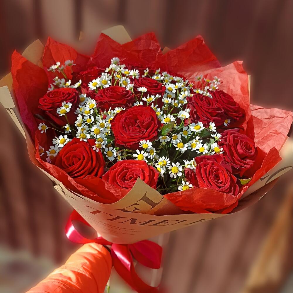Тишью – 3 шт.Матрикария – 5 шт.Крафт – 5 шт.Роза россия красная 60 см – 13 шт.
