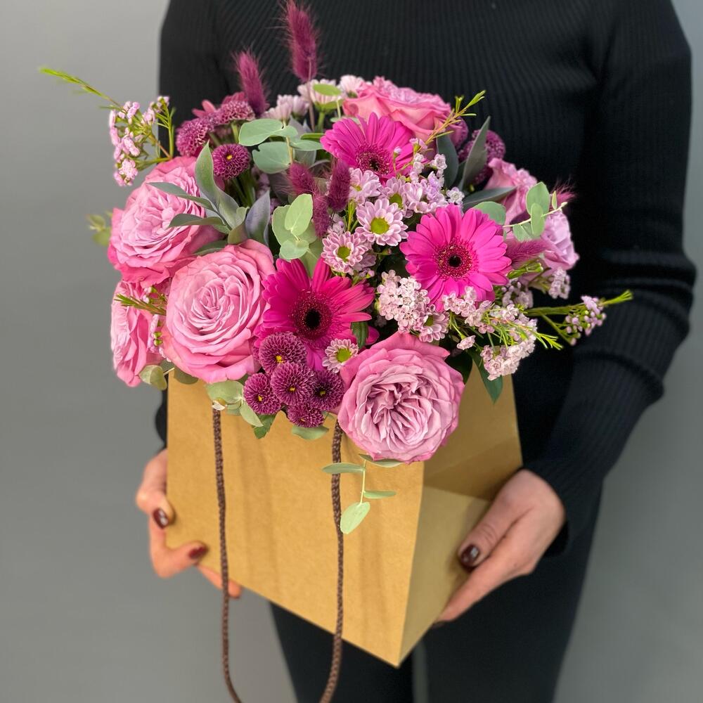 Ваксфлауэр – 3 шт.Лента – 2 шт.Рускус – 3 шт.Эвкалипт – 1 шт.Роза одноголовая – 7 шт.Гербера мини – 3 шт.Аквабокс – 1 шт.Пакет подарочный – 1 шт.Лагурус – 7 шт.хризантема сантини росси пинк – 2 шт.хризантема пурпетта – 3 шт.