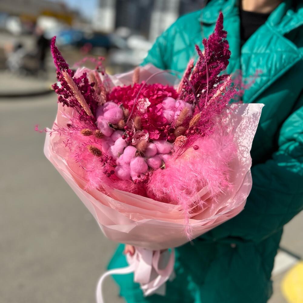 Лента атласная – 1 шт.Упаковка дизайнерская – 7 шт.Роза стабилизированная – 3 шт.Лагурус (сухоцвет) – 8 шт.Пшеница (сухоцвет) – 5 шт.Хлопок (сухоцвет) – 5 шт.овес сухоцвет – 9 шт.фаларис сухоцвет – 6 шт.кортадерия – 3 шт.гортензия розовая стабилизированная – 1 шт.мискантус розовый – 2 шт.солидаго стабилизированный – 2 шт.
