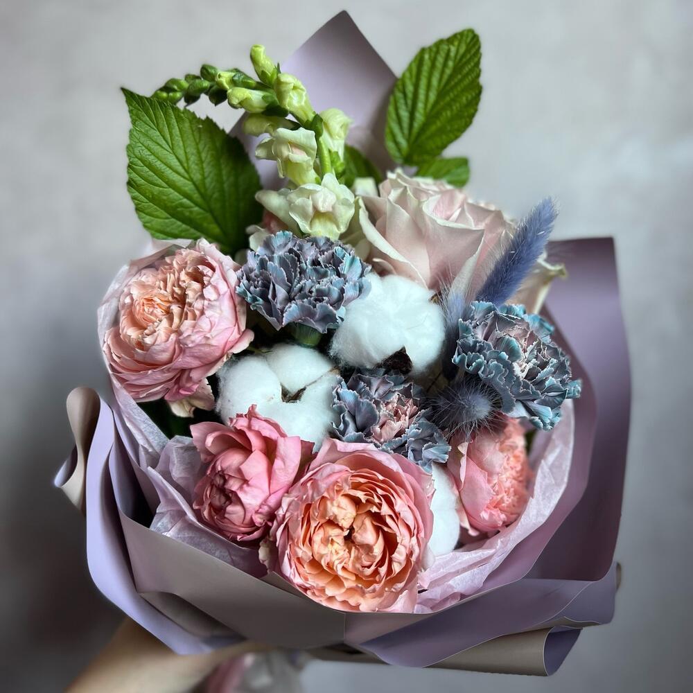 Одноголовая роза – 1 шт.Кустовая пионовидная роза – 1 шт.Антуриум – 1 шт.Гвоздика – 2 шт.зелень декоративная – 1 шт.Хлопок натуральный – 3 шт.Лагурус – 3 шт.декоративная упаковка – 1 шт.Атласная лента – 1 шт.