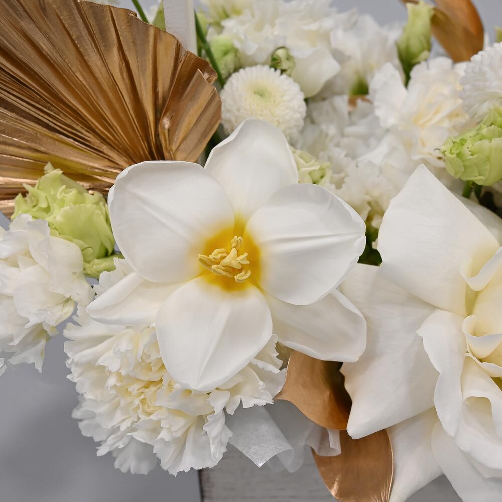 Французская роза – 1 шт.Тюльпан – 1 шт.Эустома – 2 шт.Гвоздика – 4 шт.Сантини – 2 шт.Рускус – 2 шт.Лист пальмы – 1 шт.Тишью – 1 шт.Ящик деревянный – 1 шт.
