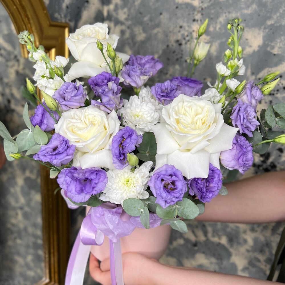 роза пионовидная плайя бланка – 3 шт.Хризантема кустовая – 1 шт.эустома лавандовая – 3 шт.Маттиола – 2 шт.Эвкалипт – 3 шт.Оазис флористический – 1 шт.Тишью белое – 1 шт.Коробка шляпная – 1 шт.Лента атласная – 2 шт.