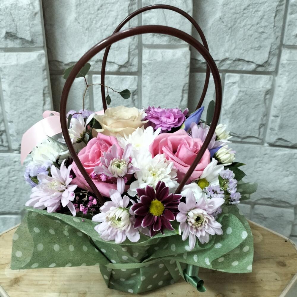 Хризантема кустовая – 2 шт.Роза – 3 шт.Лента атласная – 1 шт.Гвоздика сортовая – 1 шт.Ирис Blue Magic – 2 шт.Статица сиреневая – 1 шт.Сумочка картонная – 1 шт.Упаковка фетр – 1 шт.