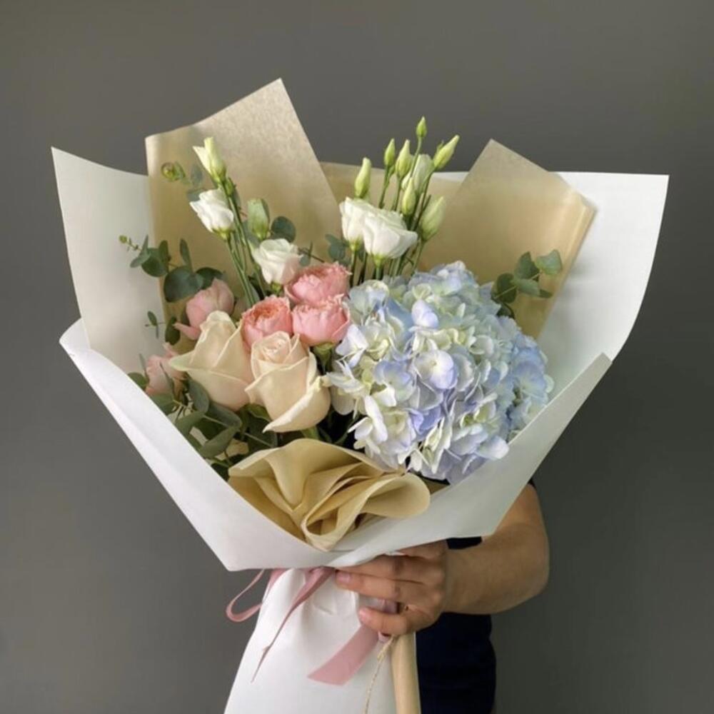 Альстромерии, Гвоздики, Кустовые розы, Лизиантусы, Розы, Хризантемы
