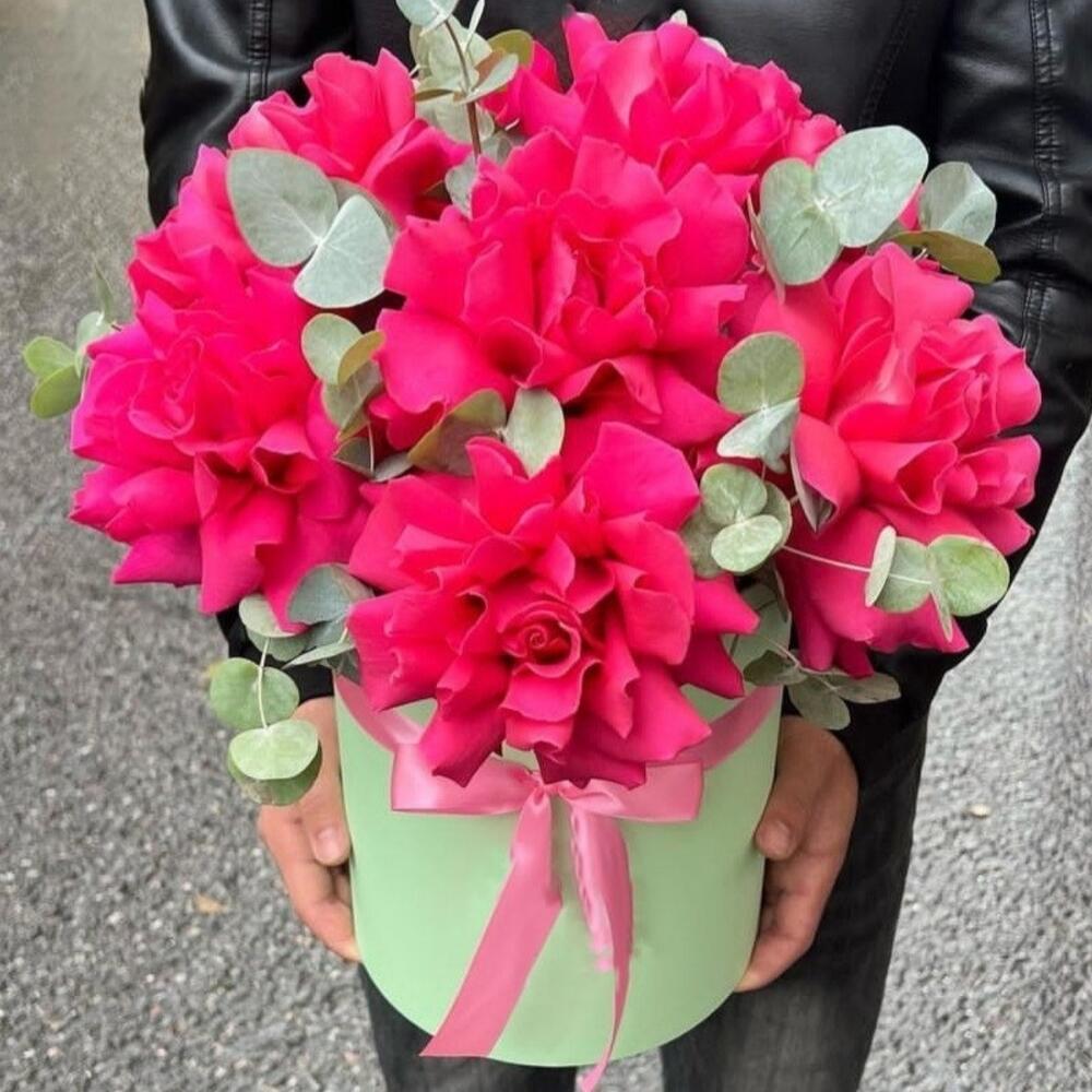 Авторская композиция с розами Мента в шляпной коробке