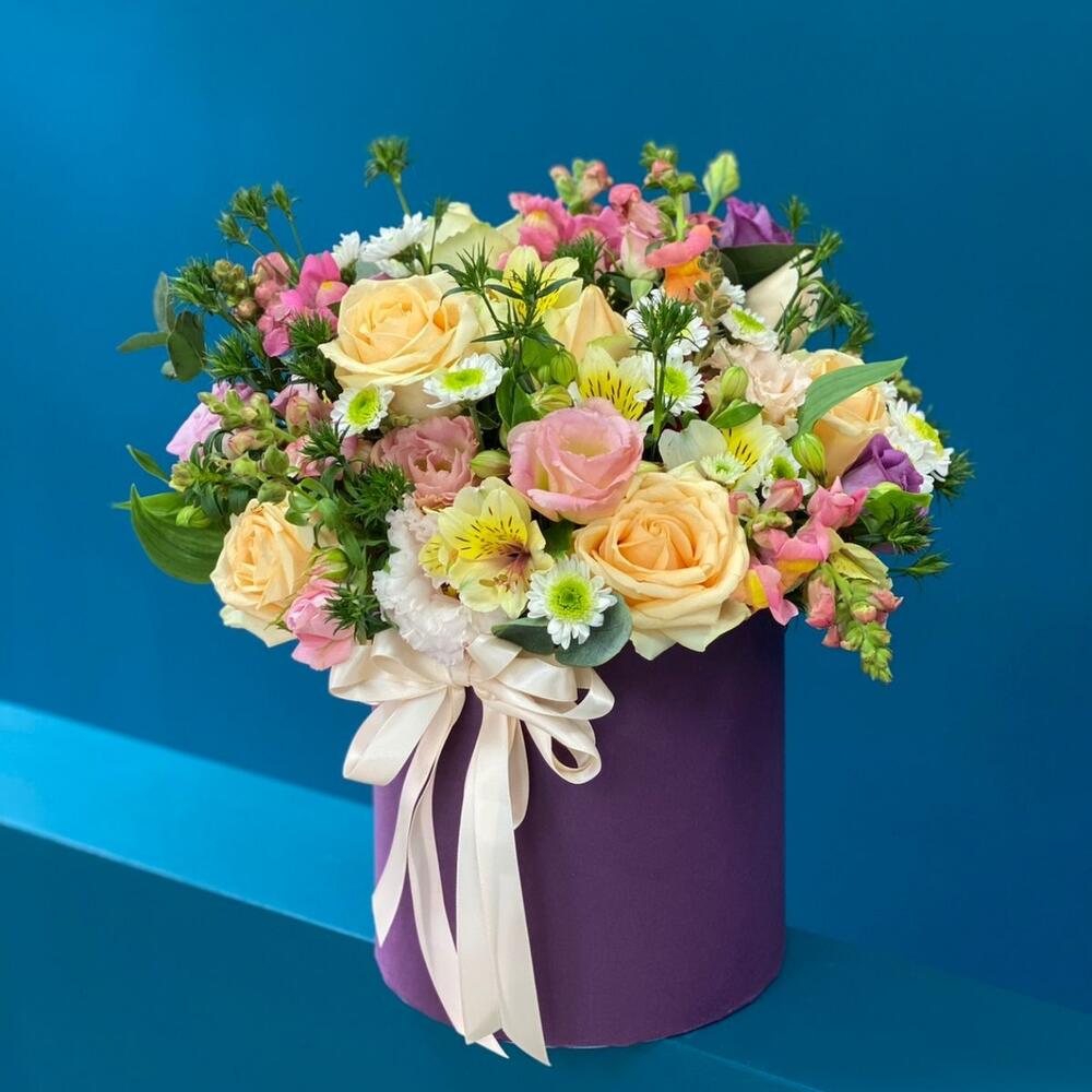 Авторская композиция из кустовых роз в шляпной коробке