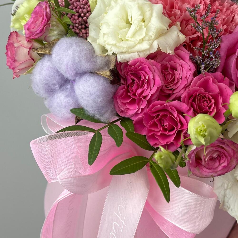 Цветы в коробке из роз ,диантуса ,хлопка ,эустомы
