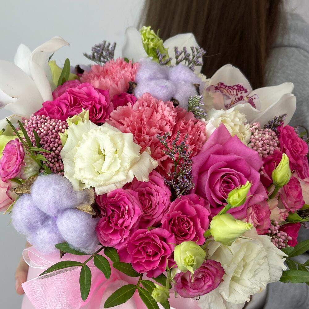 Коробка шляпная – 1 шт.Оазис флористический – 1 шт.Орхидея Цимбидиум – 3 шт.Роза Россия – 3 шт.Кустовая роза – 5 шт.эустома белая – 1 шт.Хлопок натуральный – 3 шт.Диантус – 7 шт.Фисташка пучок – 1 шт.Озотамнус розовый – 1 шт.лимуниум – 1 шт.