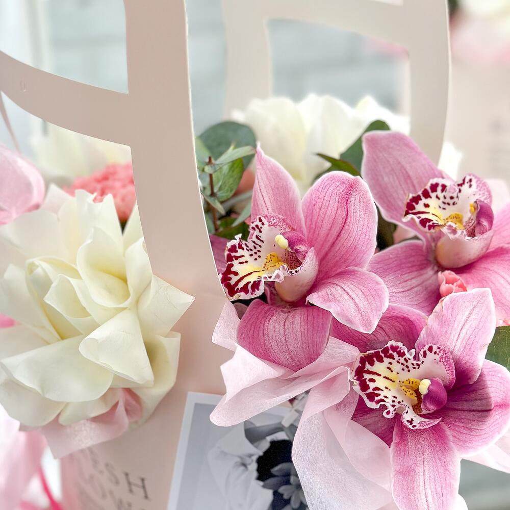 Орхидея Цимбидиум – 3 шт.Эвкалипт – 1 шт.Открыточка с вашими пожеланиями – 1 шт.Оазис флористический – 1 шт.Сумочка с ручками из плотного картона ламинированого – 1 шт.Диантус сортовой – 5 шт.роза плая бланка – 3 шт.