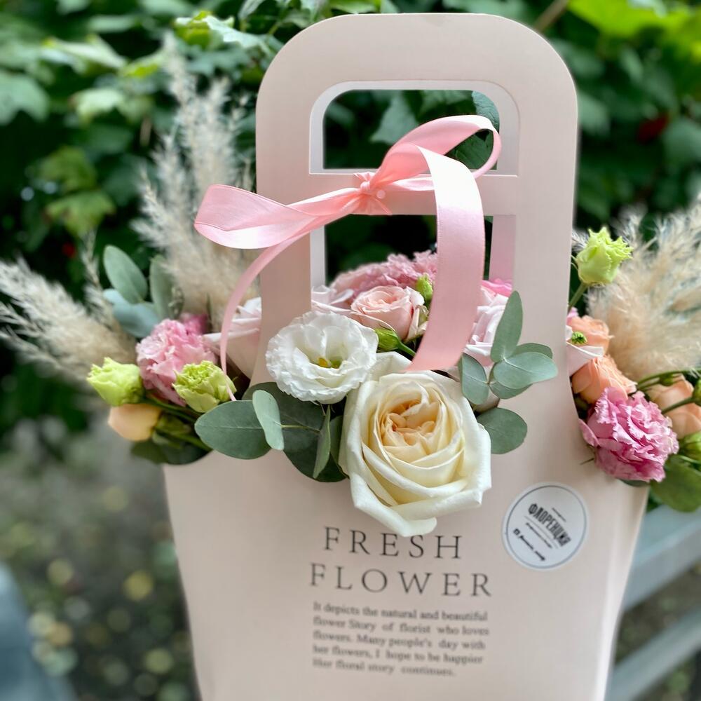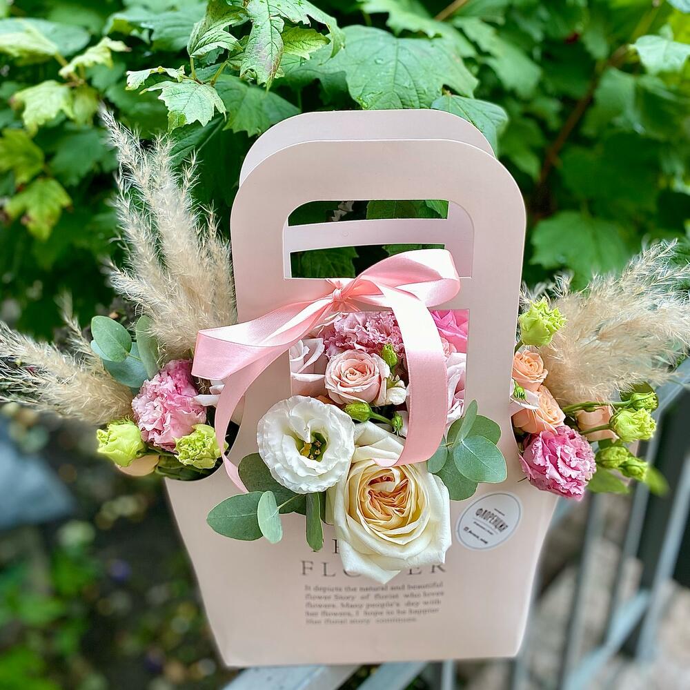 Роза пионовидная – 2 шт.Роза кустовая пионовидная – 2 шт.Эустома – 5 шт.Роза Эквадор – 3 шт.Эвкалипт – 3 шт.пампасная трава – 3 шт.Пакет крафт – 1 шт.Губка оазис – 1 шт.Лента атласная – 1 шт.