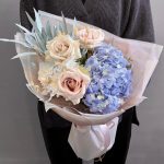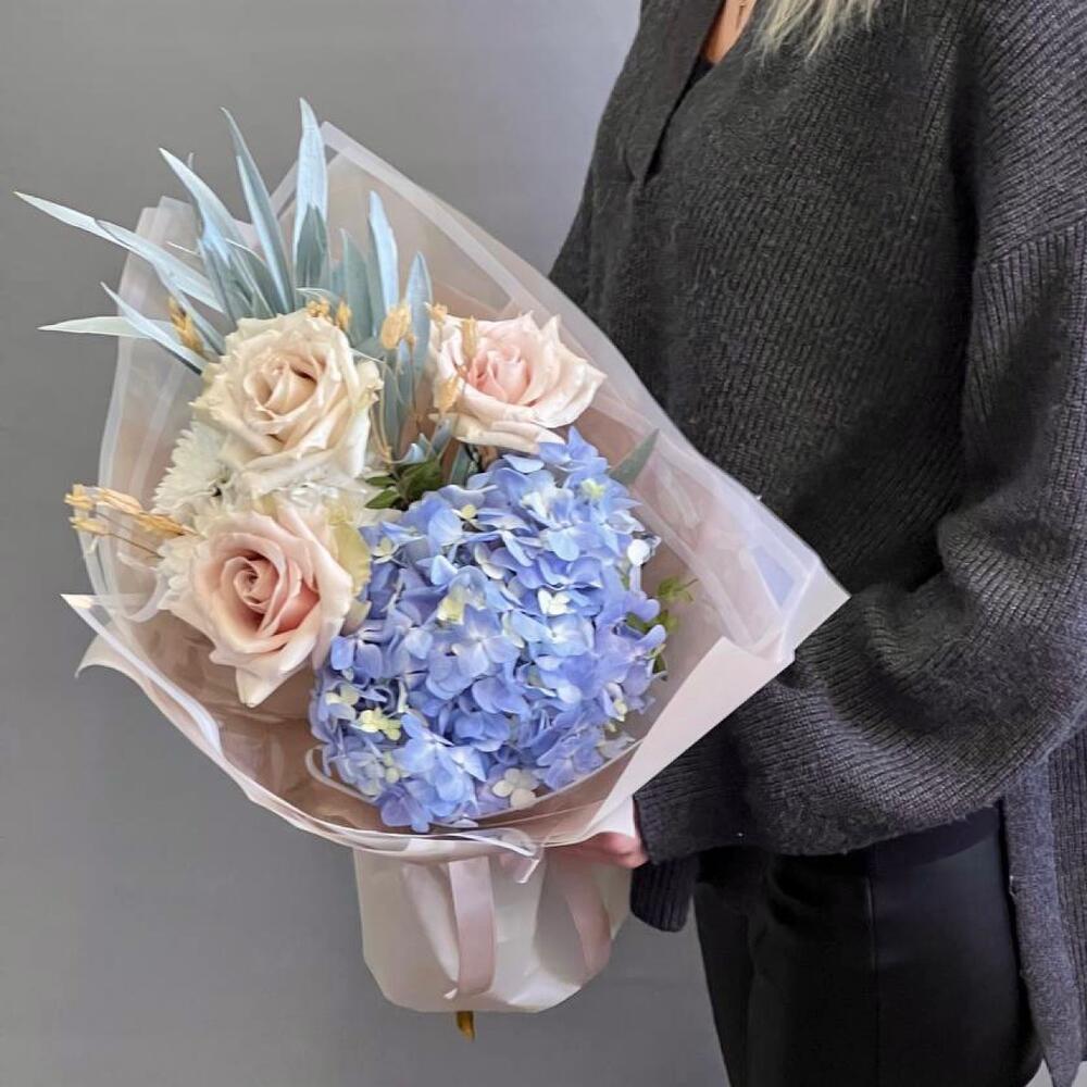 Гортензия – 1 шт.Хризантема кустовая – 1 шт.Роза Эквадор – 3 шт.Фисташка – 1 шт.Упаковка дизайнерская – 1 шт.олеандр – 1 шт.овес пучок – 1 шт.
