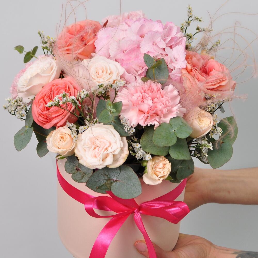 Гортензия и пионовидные розы в коробке «Милашка»