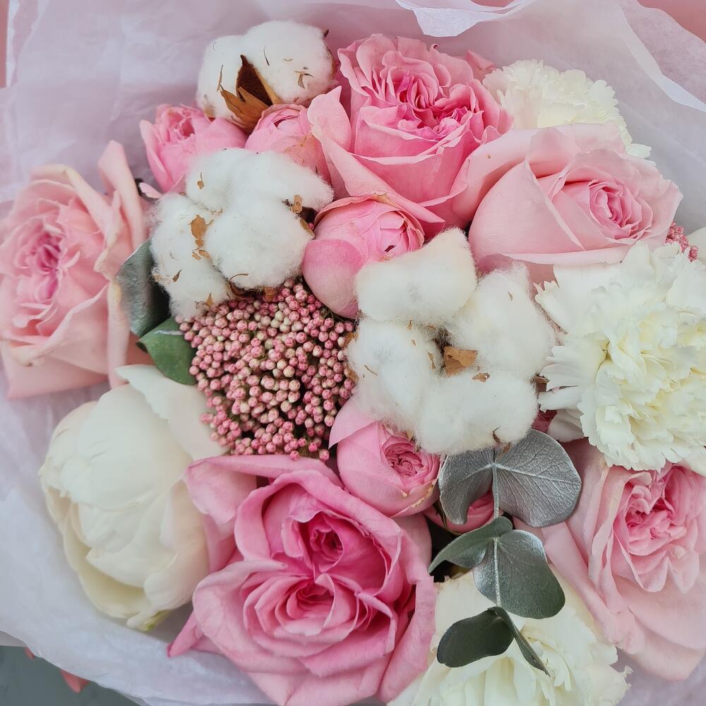 Озотамнус – 3 шт.Эвкалипт – 2 шт.Пион белый – 2 шт.эустома махровая – 3 шт.Хлопок натуральный – 3 шт.Диантус сортовой – 3 шт.pink o’hara роза – 5 шт.mansfield park – 2 шт.