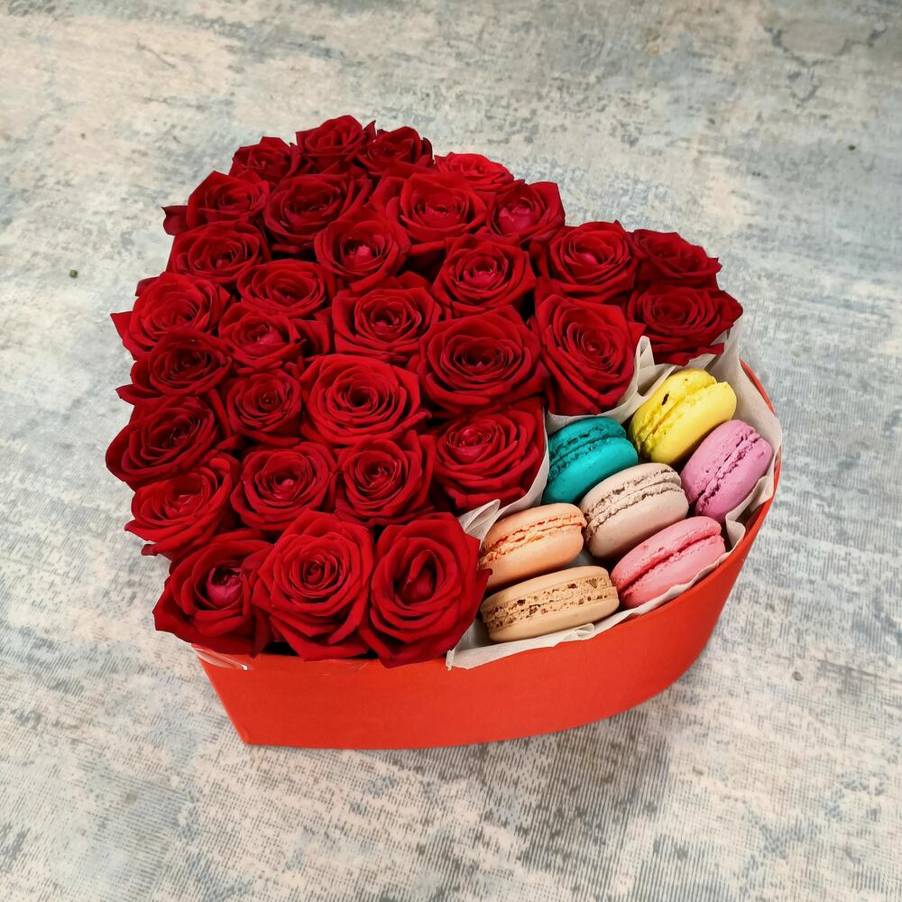 Роза – 31 шт.Пленка – 1 шт.Оазис – 1 шт.Коробка-сердце – 1 шт.Макарон – 7 шт.