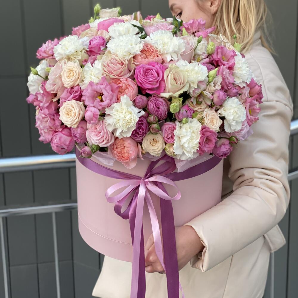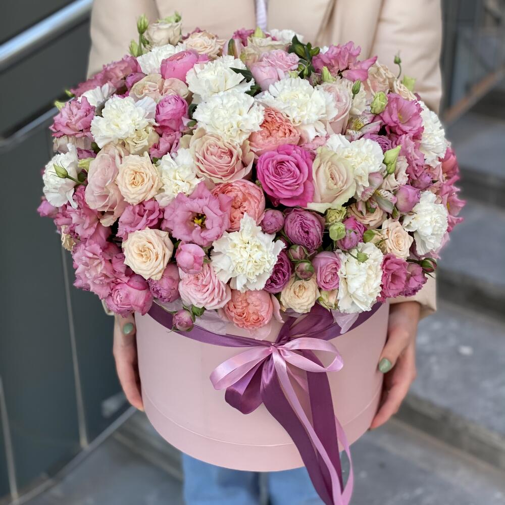 Огромная коробка с розой, эустомой, гвоздиками и альстромерией!
