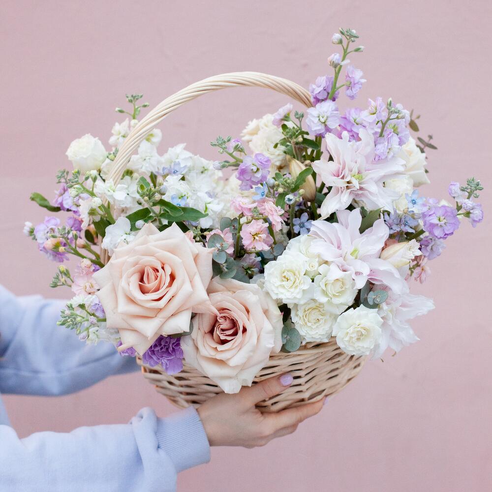 Корзина с пионовидными лилиями, полевыми маттиолами и розами