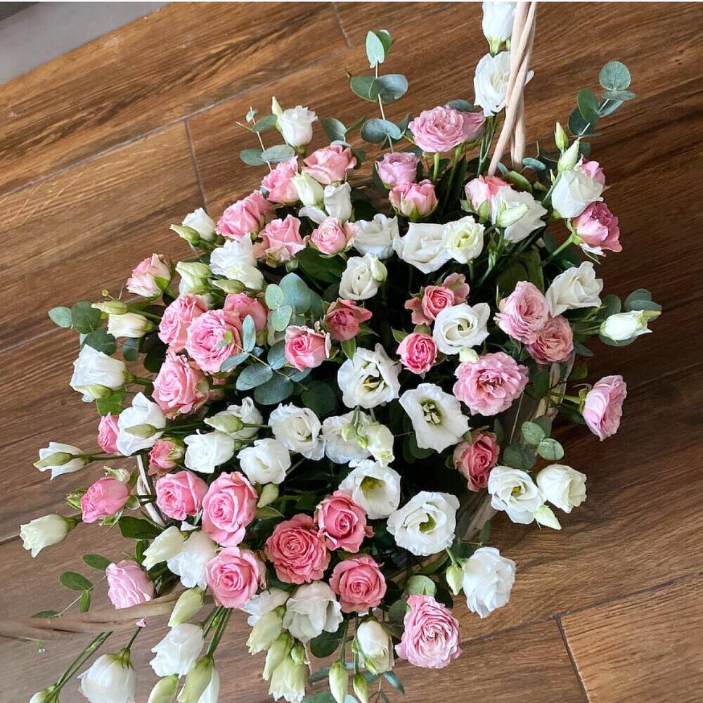Лизиантус – 10 шт.Роза кустовая – 15 шт.Эвкалипт – 7 шт.Корзина плетеная – 1 шт.Оазис флористический – 1 шт.