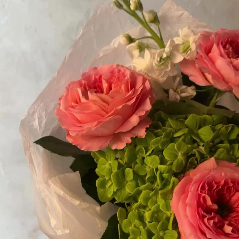 Гортензия – 1 шт.Роза пионовидная – 3 шт.Маттиола – 2 шт.Лизиантус – 1 шт.Упаковка дизайнерская – 1 шт.