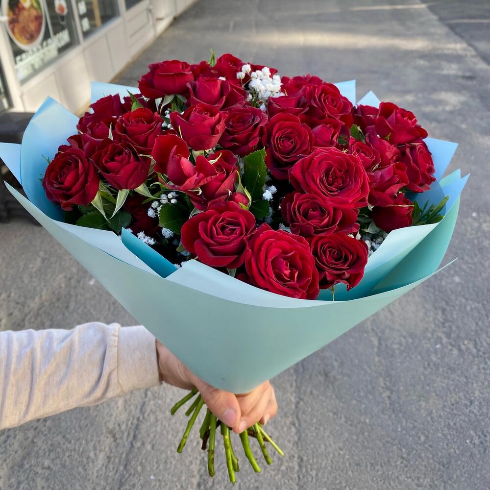 Роза кустовая – 19 шт.Гипсофила – 1 шт.Упаковка дизайнерская – 1 шт.Лента атласная – 1 шт.