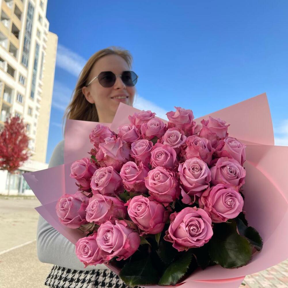 фиолетовые розы – 25 шт. Упаковка – 1 шт. Атласная лента – 1 шт.