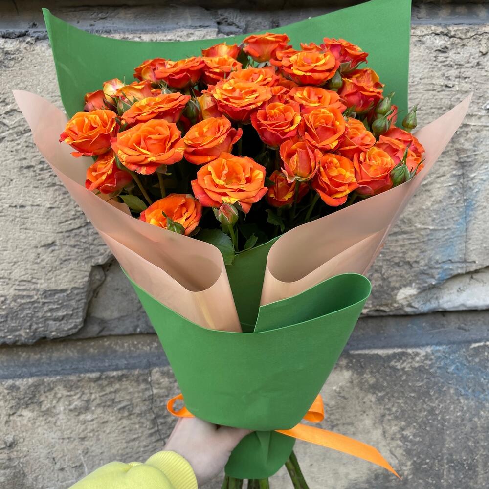 Роза кустовая – 9 шт.Фоамиран (упаковка) – 1 шт.Пленка дизайнерская – 1 шт.Лента атласная – 1 шт.