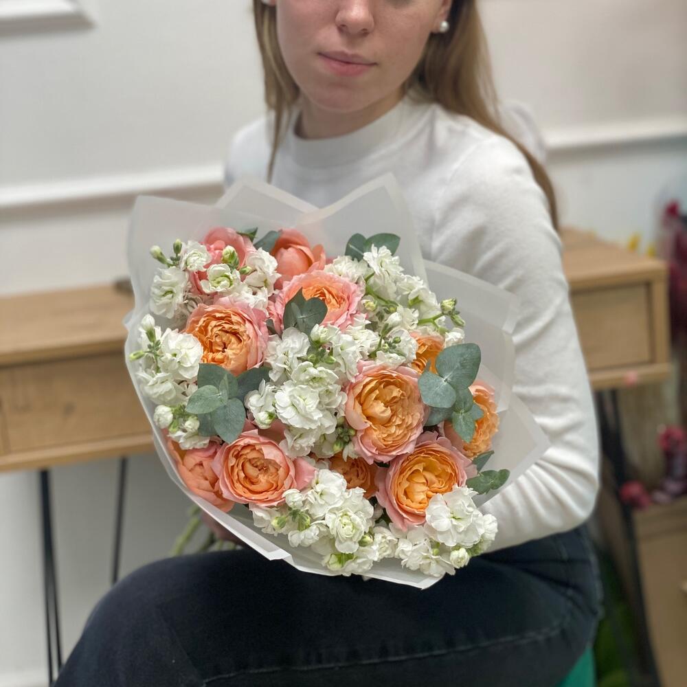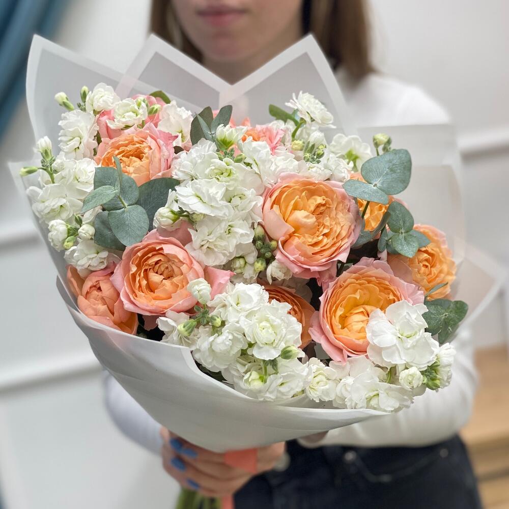 Кустовая пионовидная роза – 3 шт.Маттиола – 10 шт.Эвкалипт Baby Blue – 2 шт.Пленка матовая – 2 шт.