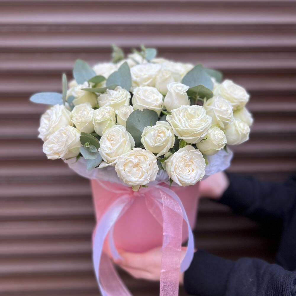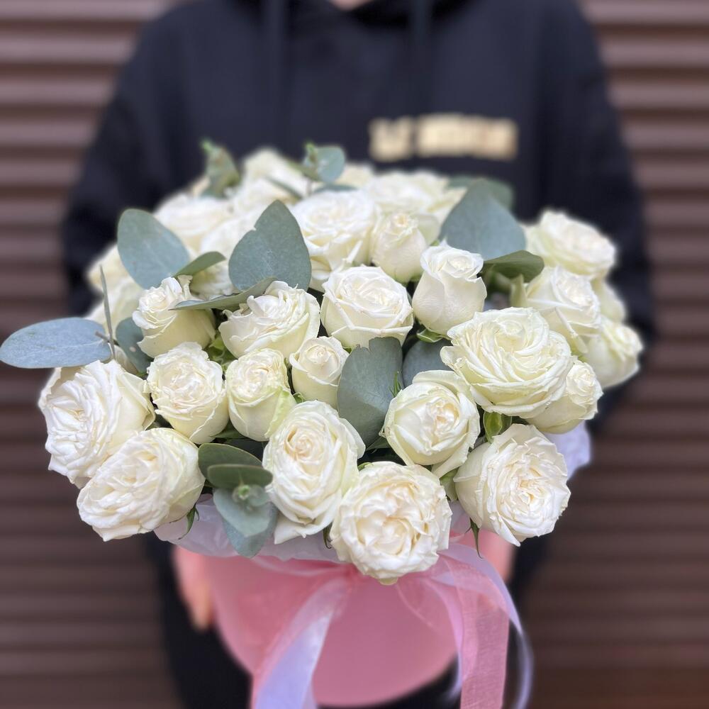 Эвкалипт – 10 шт.Лента атласная – 2 шт.Тишью – 1 шт.Коробка шляпная – 1 шт.Бомбастик – 11 шт.Оазис флористический – 1 шт.