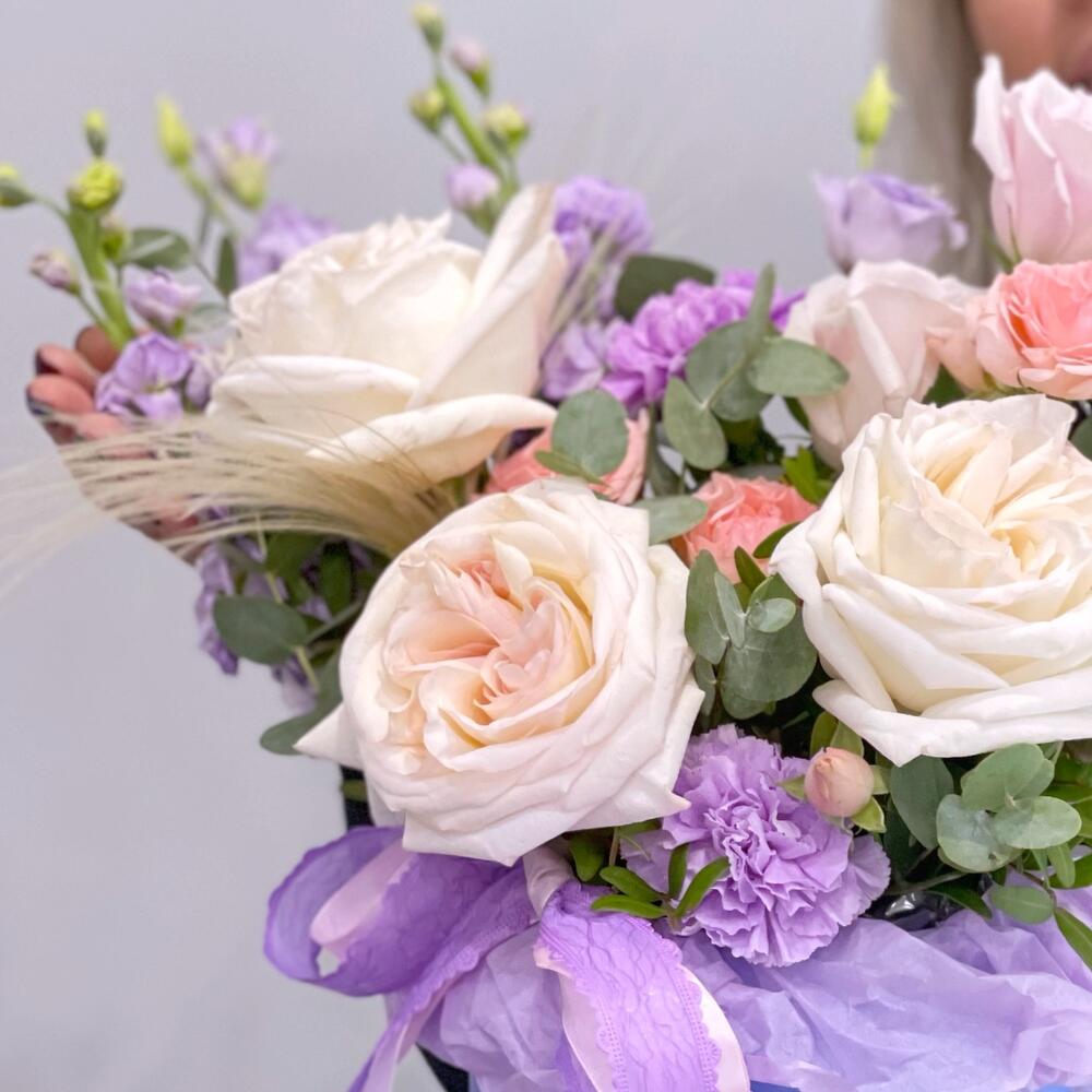 Пионовидная роза – 3 шт.Розовая роза – 3 шт.Гвоздика – 3 шт.Маттиола – 2 шт.Лизиантус – 2 шт.Кустовая роза – 2 шт.Эвкалипт – 2 шт.Фисташка – 1 шт.Ковыль – 1 шт.Шляпная коробка с лентами – 1 шт.