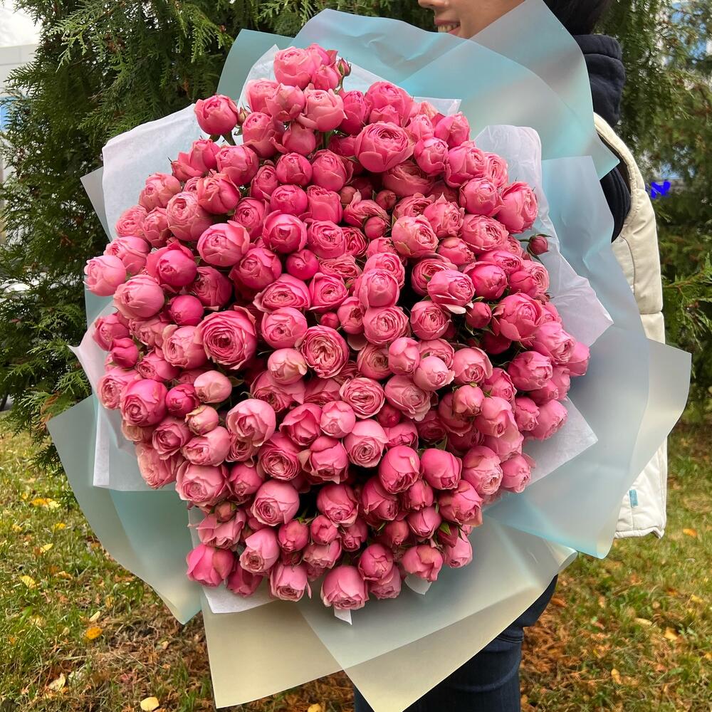 Шикарный букет из кустовой пион розы. Это прекрасный ярко розовый цветок, с прекрасным раскрытием. Розы после раскрытия напоминают пион, по этому и получили название пионовидные розы. Если доставка вам нужна срочно, то напишите нашим менеджерам и мы отправим букет максимально быстро .